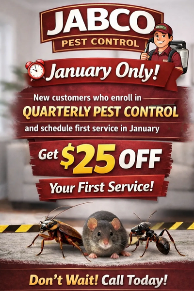 Sign up for a quarterly pest control service with us and schedule your first service in January and receive $25 off your first treatment!